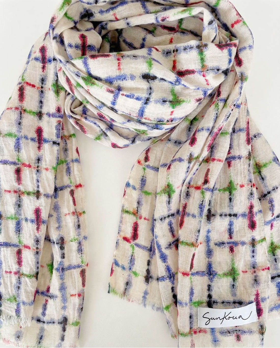 Rectangular scarf made of 100% cotton with multicolor geometric grid print. Design with short fringes at the ends.